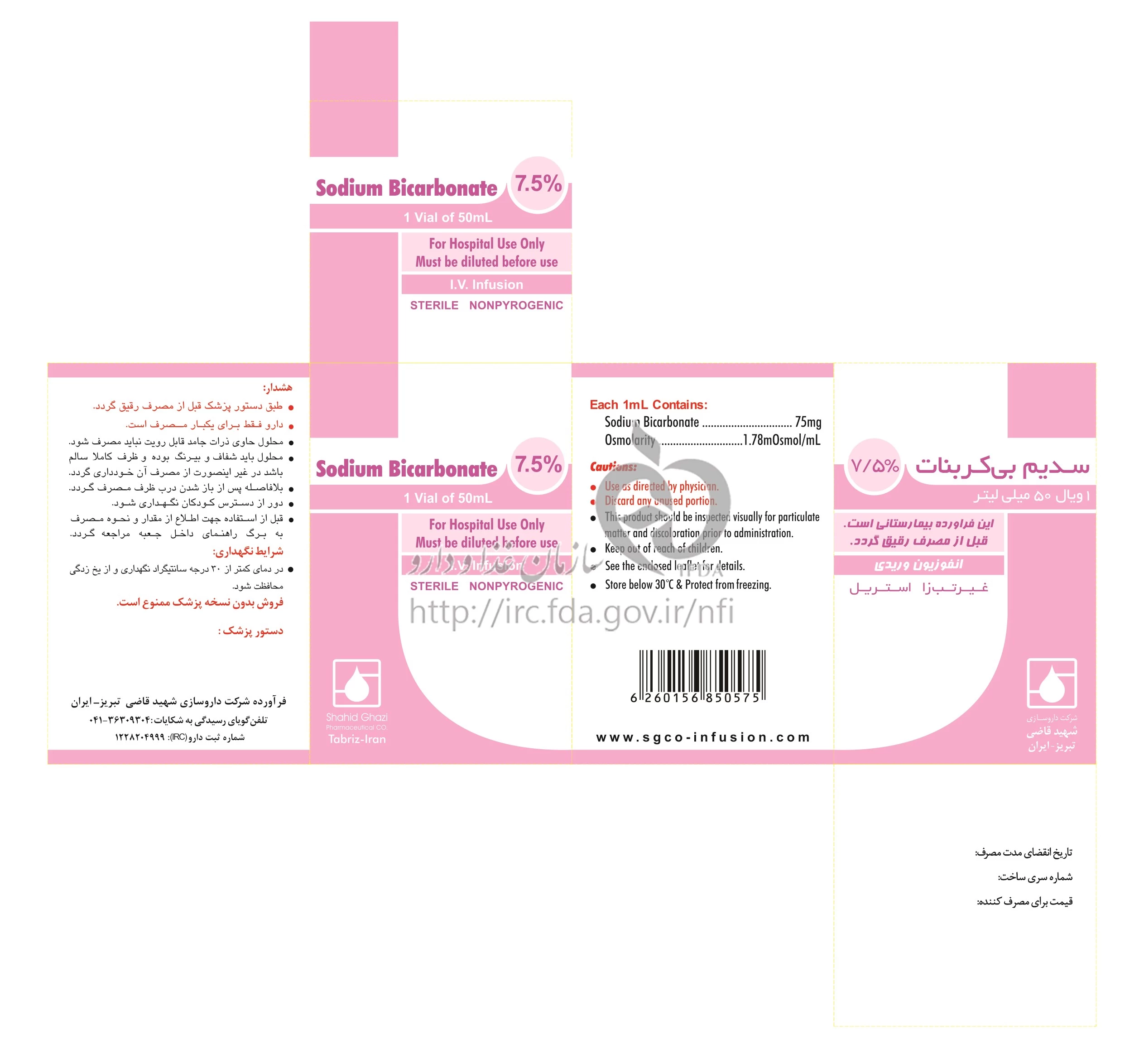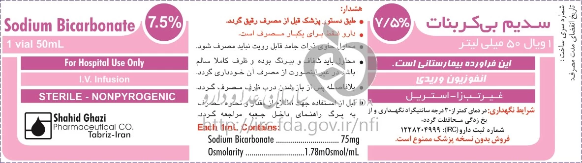 سدیم بیکربنات تزریقی پرنترال 7.5 % 50MILLILITER