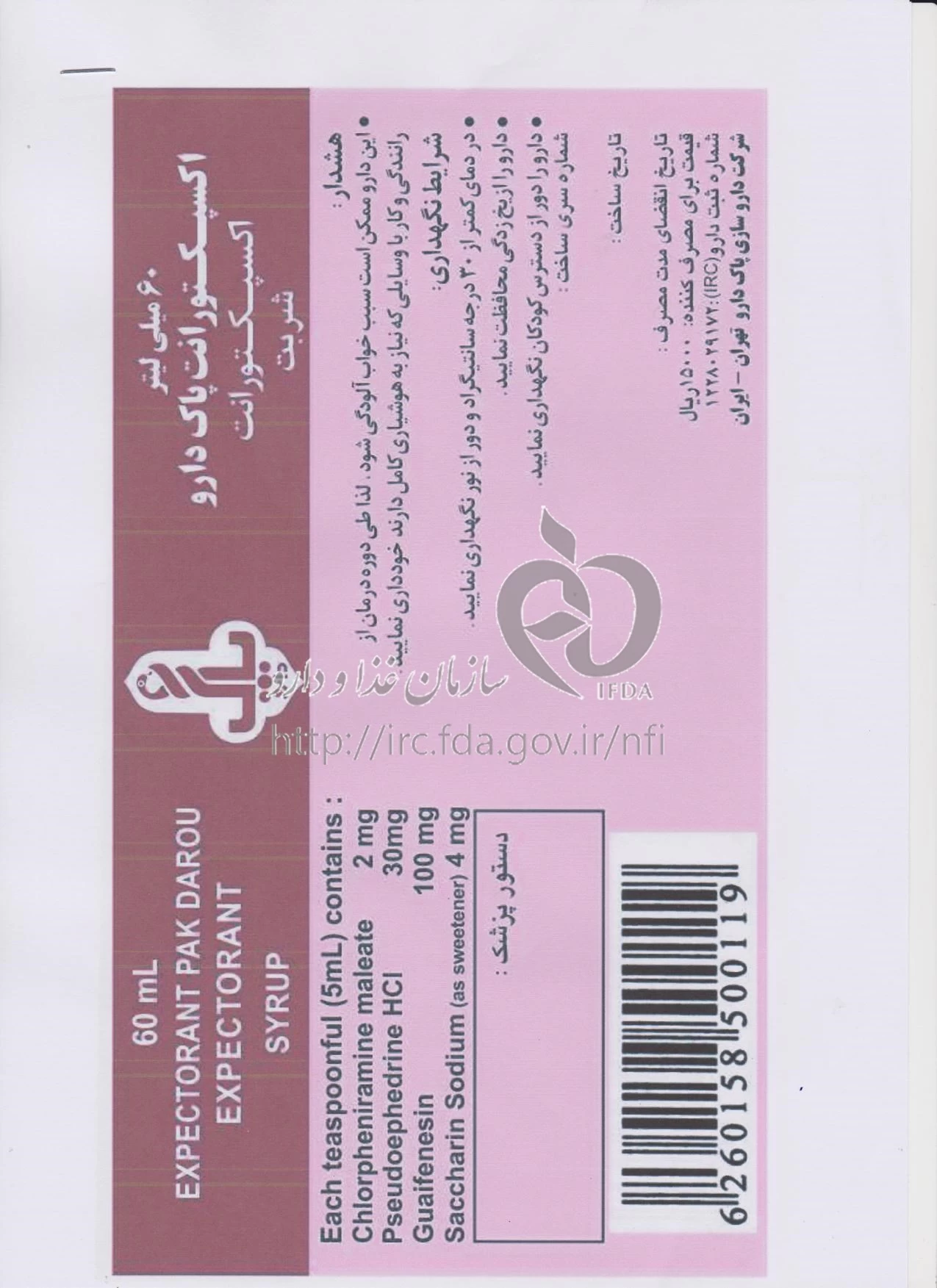 دکترها اکسپکتورانت پاک دارو شربت خوراکی 100 mg/2 mg/30 mg/5mL 60MILLILITER