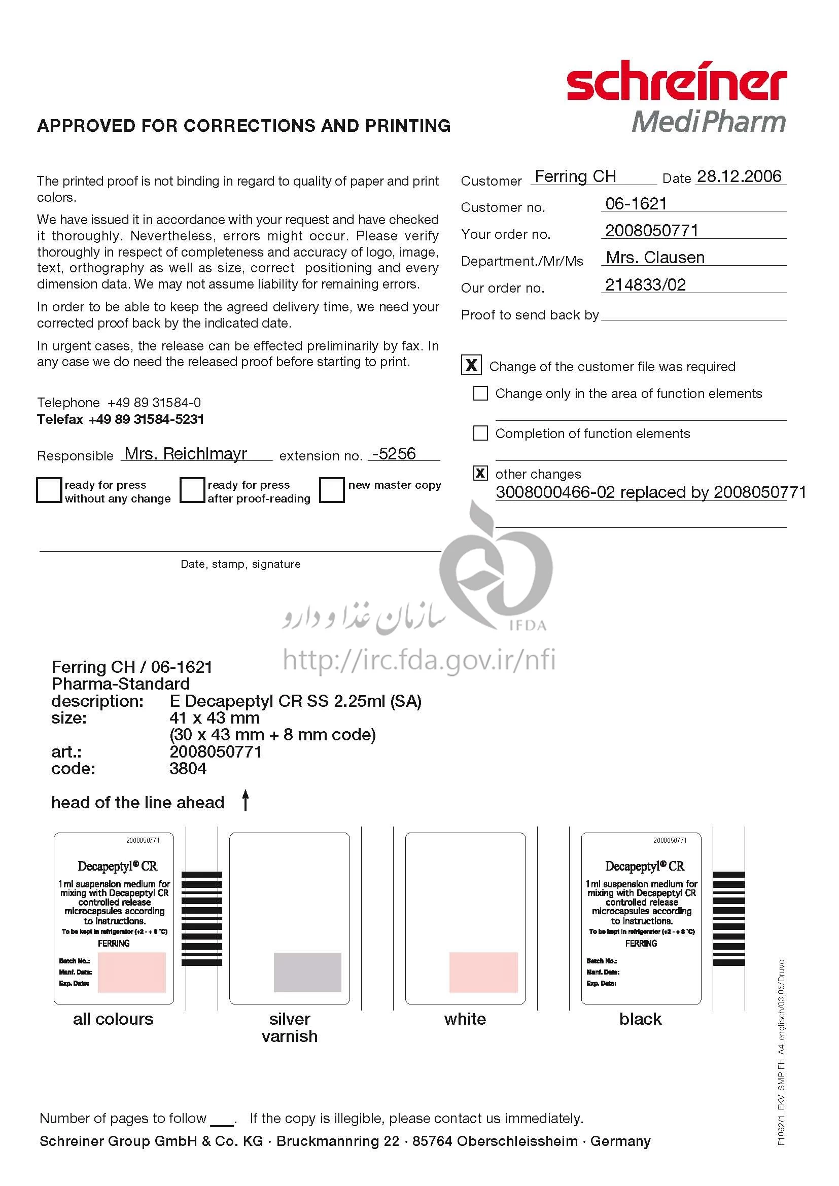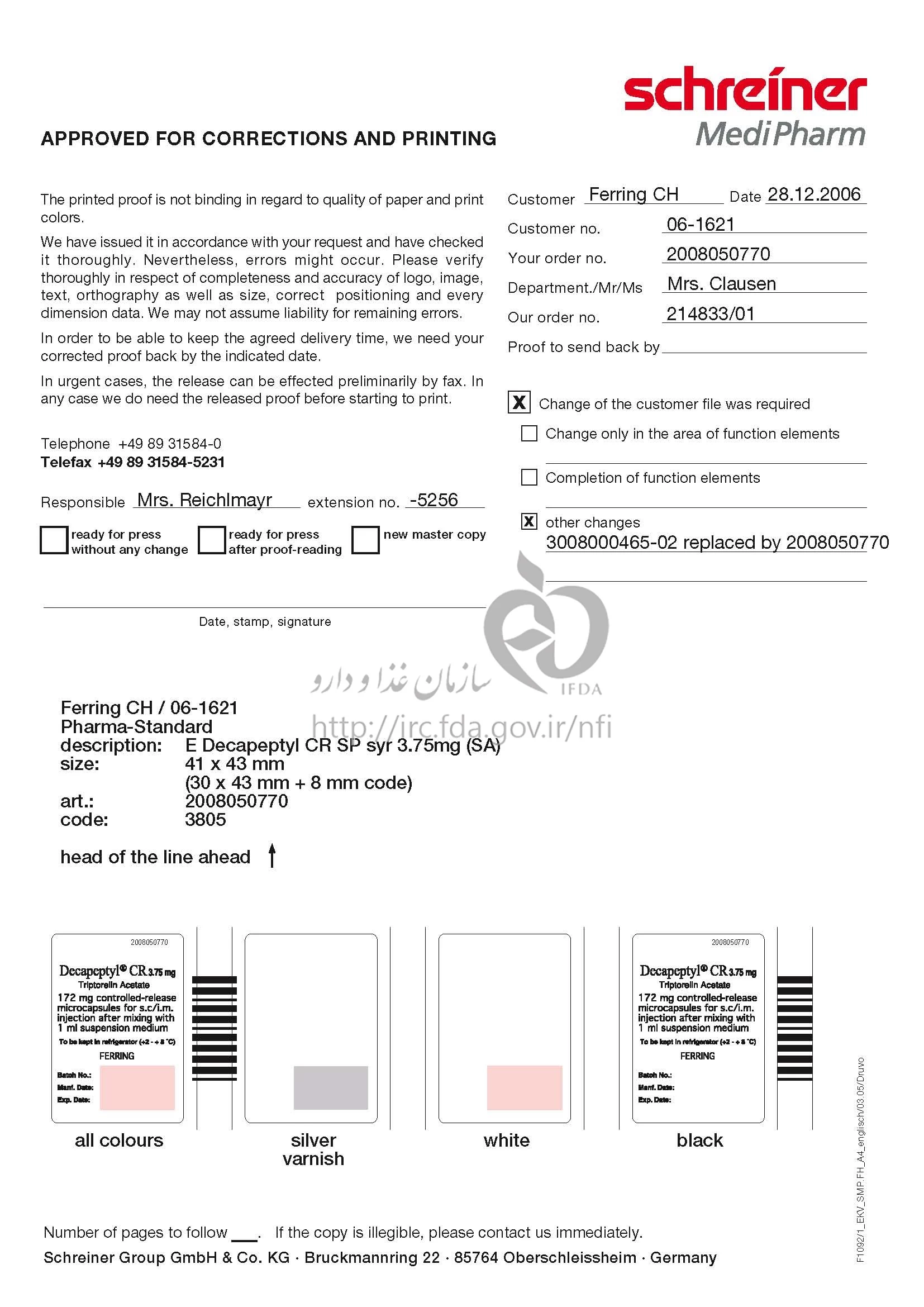تداخل های دارویی دکاپپتیل پودر لیوفیلیزه سوسپانسیون تزریقی آهسته رهش پرنترال 3.75 mg