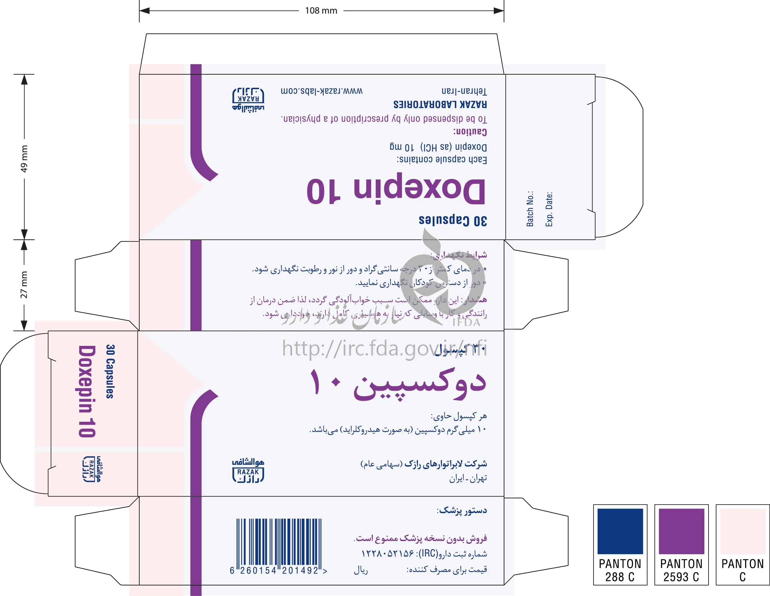 داروی DOXEPIN CAPSULE ORAL 10mg یک داروی ضد افسردگی از دسته داروهای تری سیکلیک است که برای درمان افسردگی، اضطراب و اختلالات خواب استفاده می‌شود. این دارو با کاهش سطح عملکرد سروتونین و نوراپی‌نفرین در مغز، بهبود وضعیت روانی فرد را بهبود می‌بخشد. نحوه مصرف این دارو به چشم انداز پزشک و با توجه به وضعیت بیمار و علائم او تعیین می‌شود. معمولاً، شروع دارو با دوز کمتر از ۱۰ میلی‌گرم به مرور افزایش پیدا می‌کند. به صورت عمده، این دارو روزانه یکبار، در عرض چند هفته تا چند ماه استفاده می‌شود. مصرف این دارو باید تحت نظارت پزشک باشد.