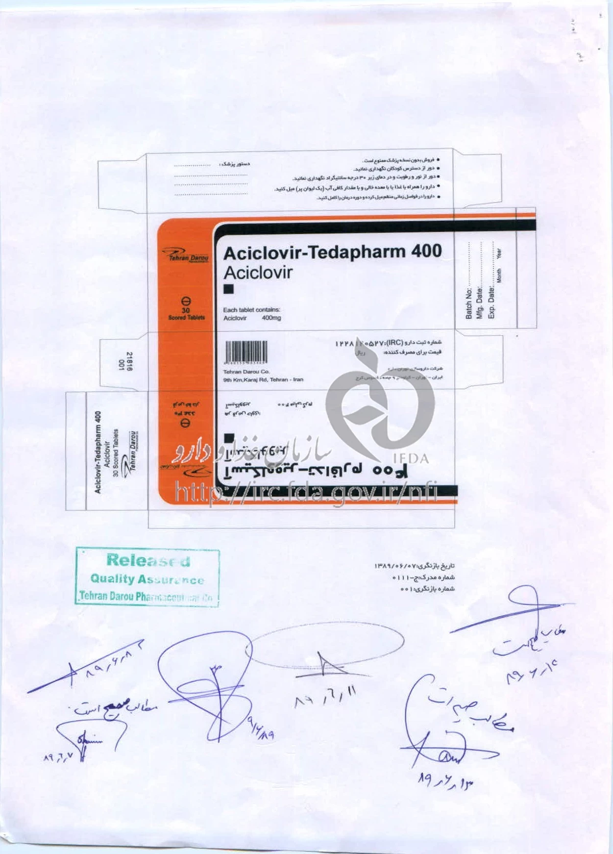 آسیکلوویر - تدافارم قرص خوراکی 400 mg