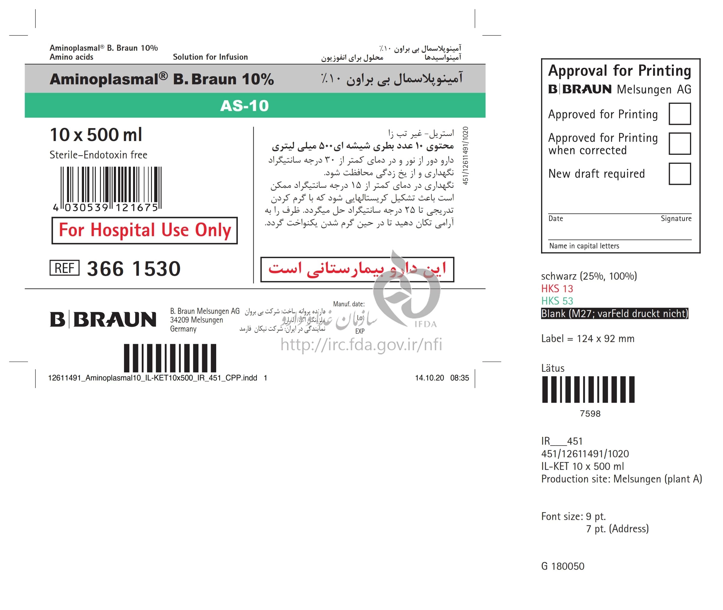 آمینوپلاسمال بی.براون 10 % محلول تزریقی داخل وریدی 5 mg/8.9 mg/5.74 mg/3.12 mg/4.4 mg/4.7 mg/4.2 mg/1.6 mg/6.2 mg/11.5 mg/3 mg/10.5 mg/12 mg/5.6 mg/7.2 mg/5.5 mg/2.3 mg/0.4 mg/1mL 500MILLILITER