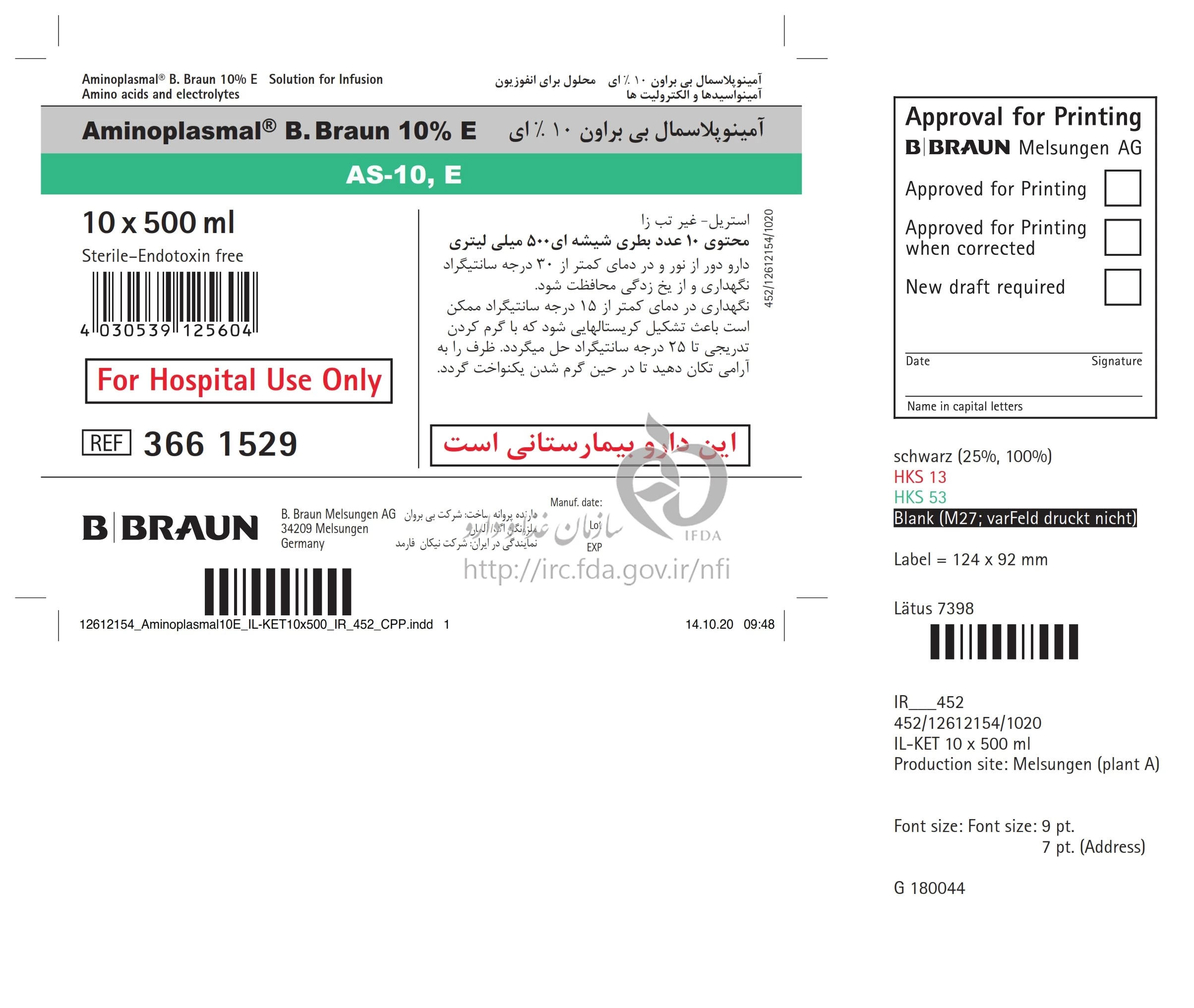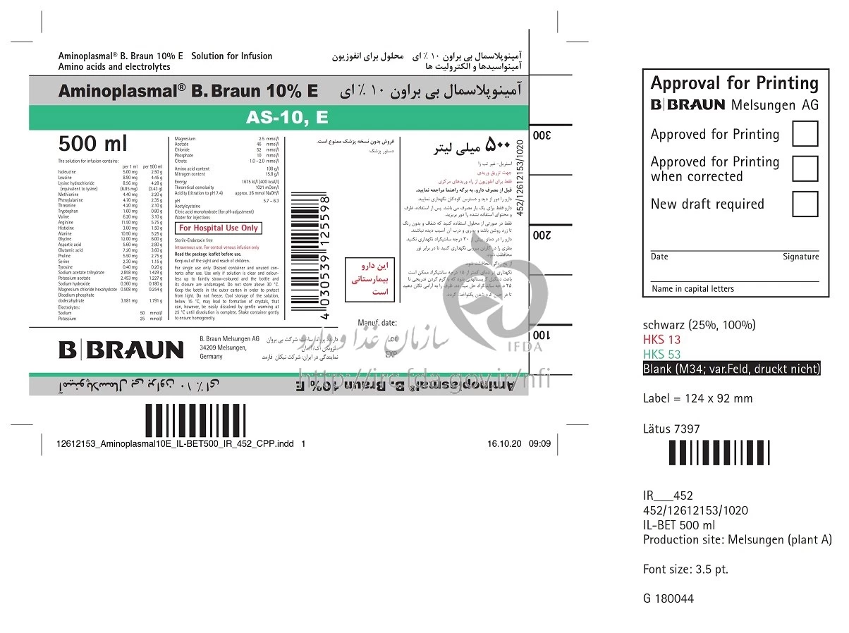 آمینوپلاسمال بی.براون 10% الکترولیت محلول تزریقی داخل وریدی 5 mg/8.9 mg/8.56 mg/4.4 mg/4.7 mg/4.2 mg/1.6 mg/6.2 mg/11.5 mg/3 mg/10.5 mg/12 mg/5.6 mg/7.2 mg/5.5 mg/2.3 mg/0.4 mg/2.858 mg/0.36 mg/2.453 mg/0.508 mg/3.581 mg/1mL 500MILLILITER