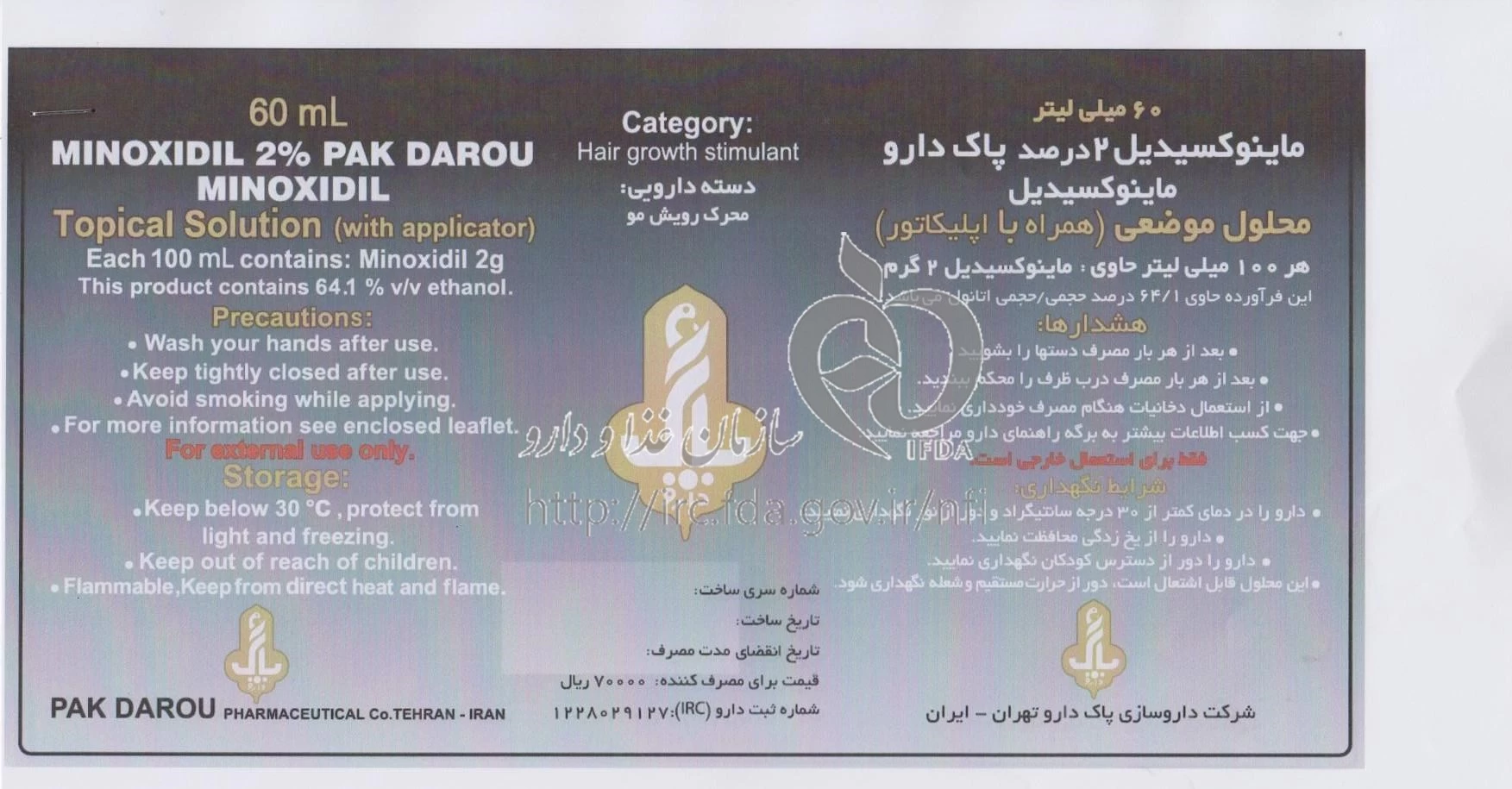 ماینوکسیدیل پاک دارو محلول موضعی 20 mg/1mL 60MILLILITER