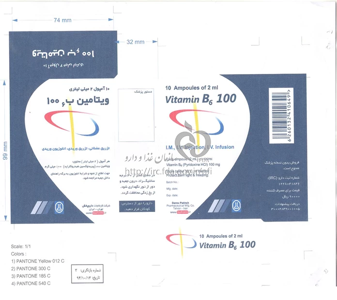 Vitamin B6 Injection Parenteral 50mg/1mL - 2mL در واقع نوعی ویتامین است که برای درمان بیماریهایی همچون کمبود ویتامین B6 و برخی بیماریهای عصبی مانند اعتیاد به الکل، اختلالات خلقی، درمان نوروپاتی آلکلی و انواع بیماری های قلبی استفاده میشود. این دارو با دستور پزشک و به صورت تزریقی از طریق عضلانی یا وریدی استفاده میشود و مدت زمان و مقدار دقیق مصرف این دارو باید توسط پزشک به شما تعیین شود. قبل از مصرف هر گونه داروی تزریقی، باید ابتدا با پزشک خود مشورت کنید.