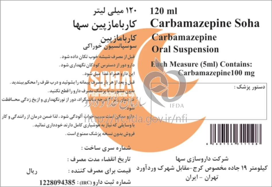 کاربامازپین سها سوسپانسیون خوراکی 100 mg/5mL 120MILLILITER