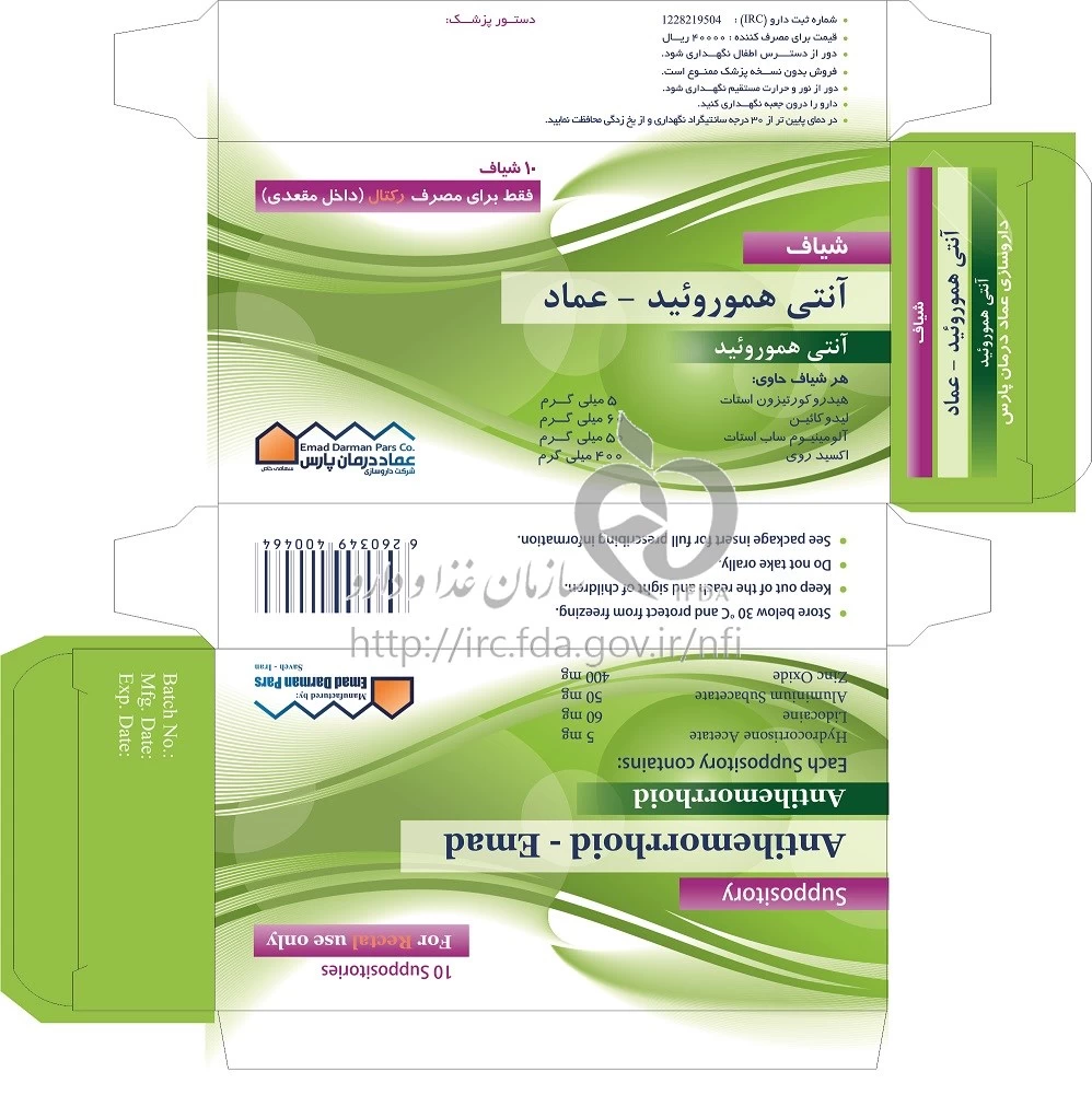 آنتی هموروئید - عماد شیاف مقعدی 60 mg/5 mg/50 mg/400 mg