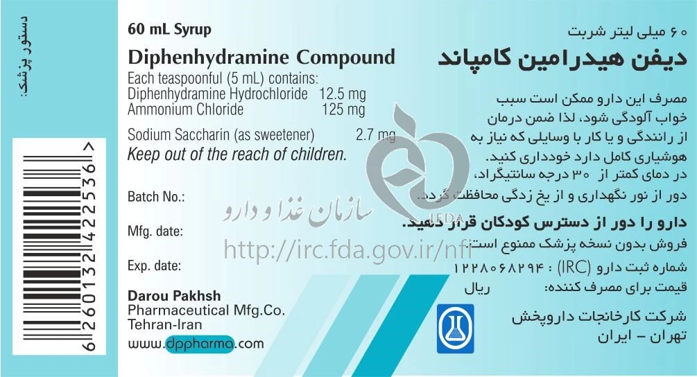 این دارو ترکیبی از دو ماده است: Diphenhydramine و Ammonium Chloride است و برای درمان سرما، سرفه، عطسه و احتقان بینی به کار می‌رود. این دارو با کاهش ترشحات بینی و رفع التهابات دستگاه تنفسی عمل می‌کند. نحوه مصرف این دارو به شرح زیر است: - بطور دقیق دستور پزشک را دنبال کنید. - دارو را با کمی آب میل کنید. - از این دارو معمولاً سه بار در روز استفاده می‌شود. - قبل از استفاده تکان داده شود و با دوزسنج، میزان مصرف وزنی برای کودکان بسته به سن ووزن محاسبه گردد. - داروی DIPHENHYDRAMINE / AMMONIUM CHLORIDE SYRUP ORAL 12.5 mg/125 mg/5mL 60MILLILITER به موقع و بدون تغییر دوز مصرف شود. قبل از مصرف این دارو، بهتر است با یک پزشک یا داروساز مشورت کنید.
