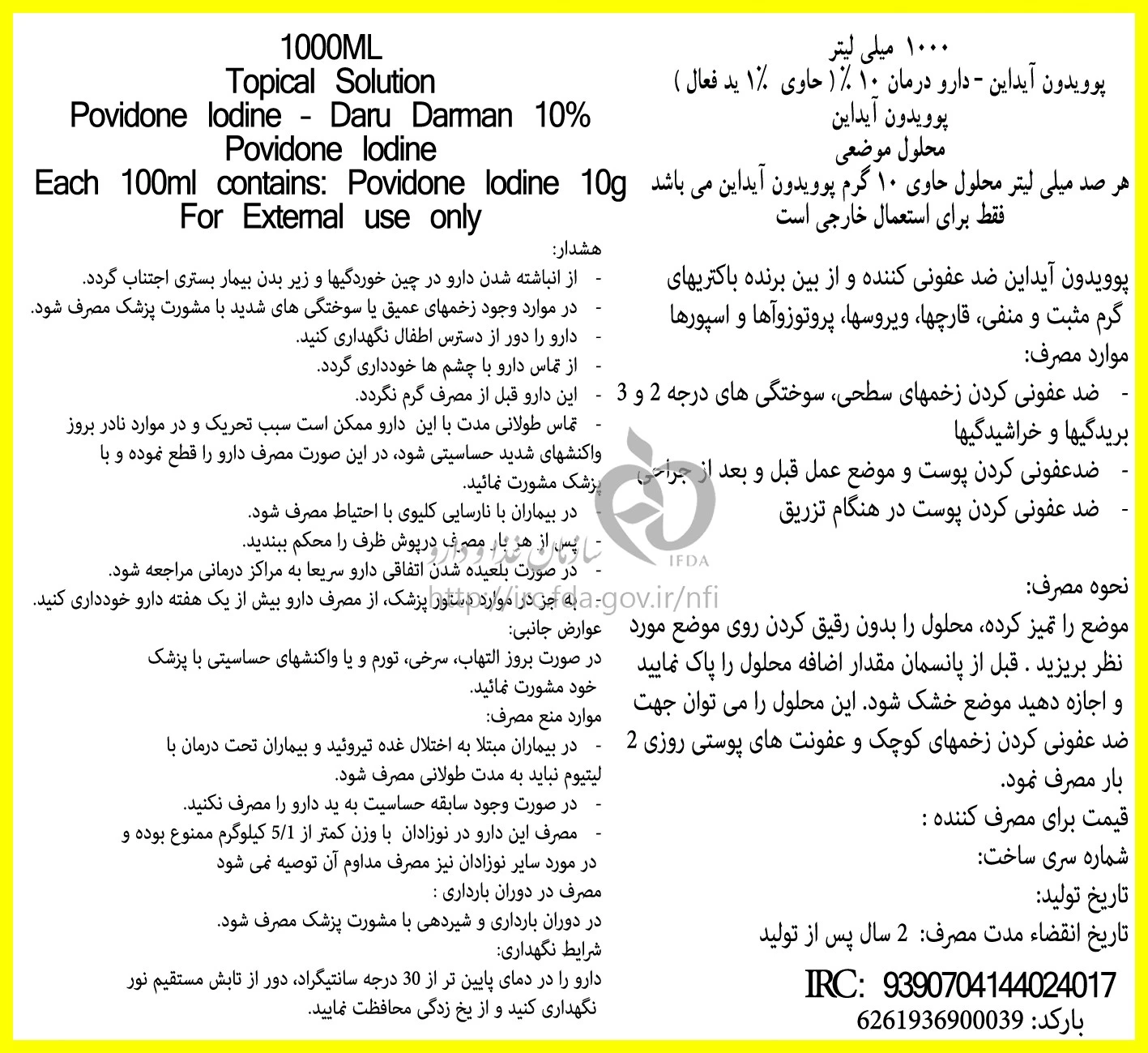 پوویدون آیداین - دارو درمان محلول موضعی 10 % 1000MILLILITER